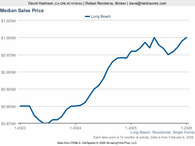 In Long Beach, median home sales values have risen approximately 2% year-over-year (Jan 2025-Jan 2026). Which is pretty steady and reflective of a more normal, balanced marketplace.
