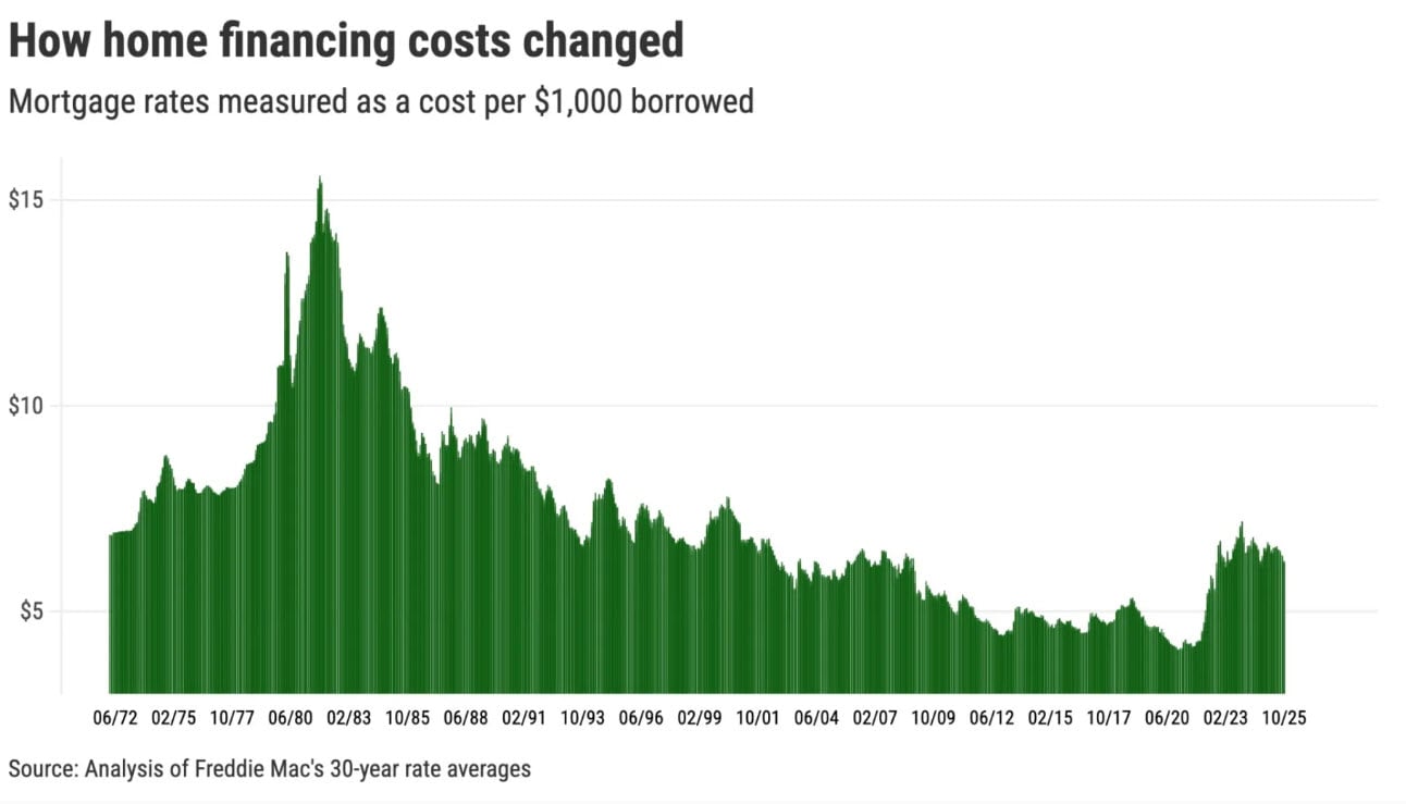 Now, let’s put that in perspective. In October 1981, rates hit a jaw-dropping 18.63%, meaning buyers paid about $15.59 per $1,000 borrowed — a staggering 154% higher than today’s cost. So yes, things could be much worse.